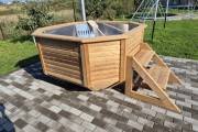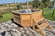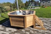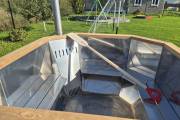 Большой надёжный чан для купания из нержавеющей стали восьмиугольной формы. Благодаря широким стенам и регулирующимся по высоте скамейкам обеспечивается особый комфорт при купании. Края сидений аккуратно закруглены во избежании неприятных ощущений.