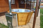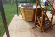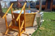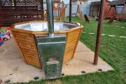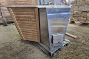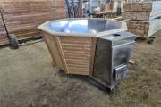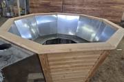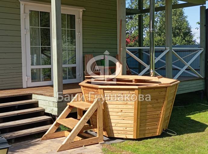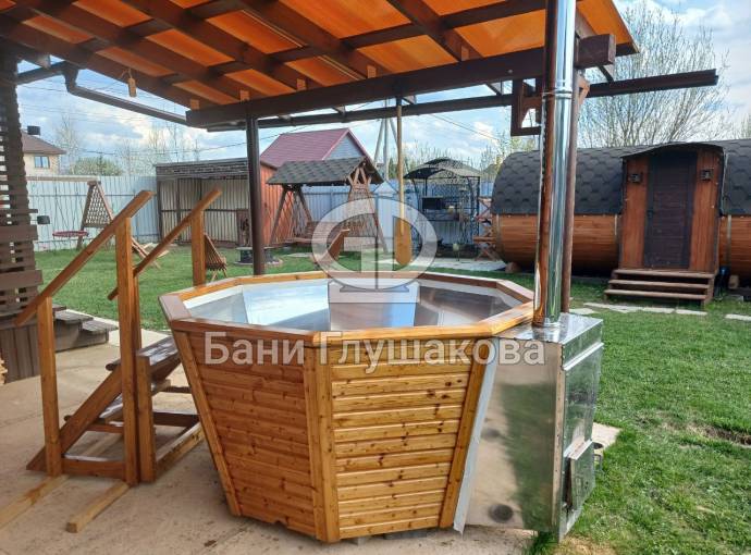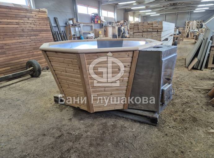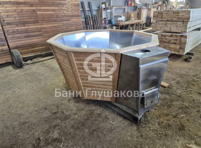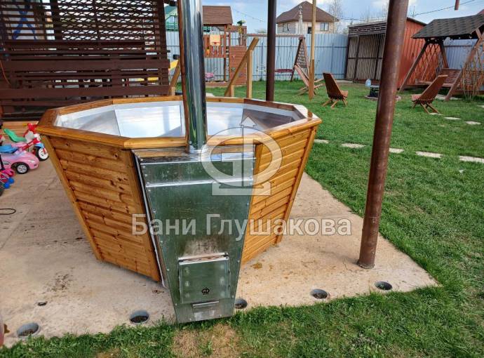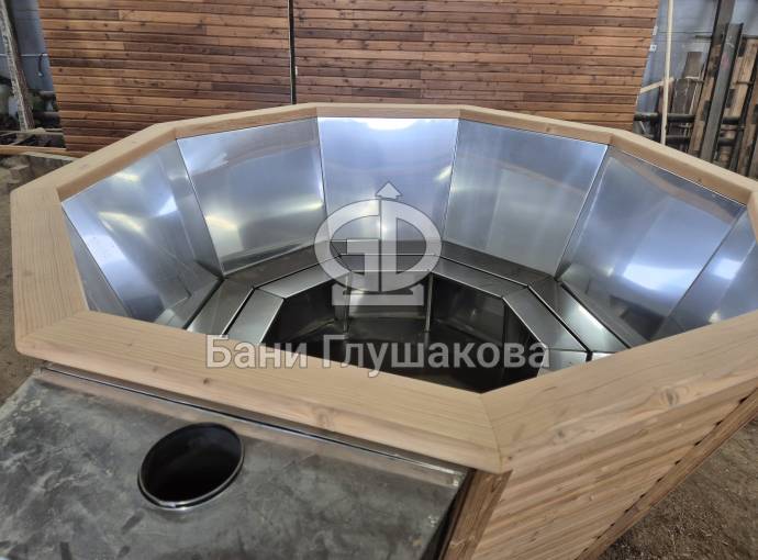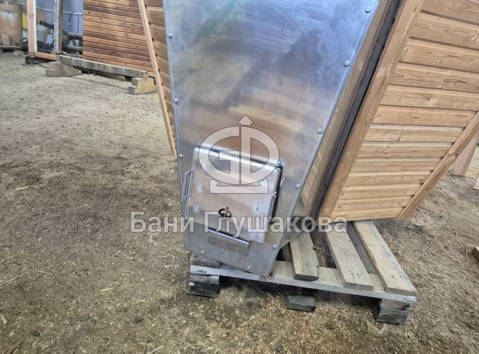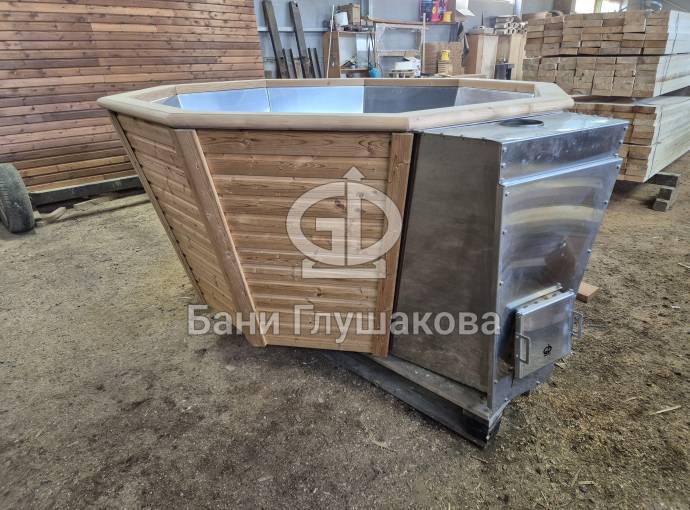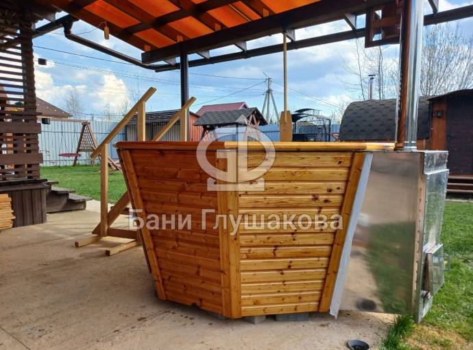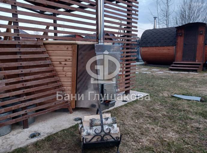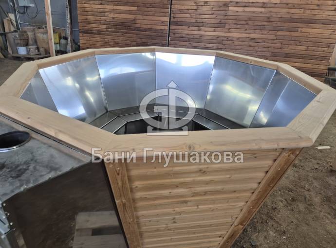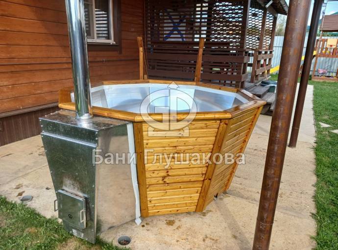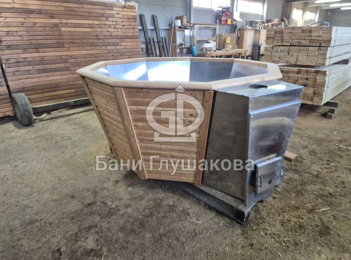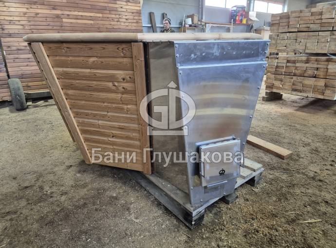 Чан укомплектован мощной наружной встроенной печью нашего производства. Она примыкает снаружи, экономя пространство внутри. Нагрев чана в зависимости от температуры воды, объёма и температуры окружающей среды занимает 2-3 часа.
