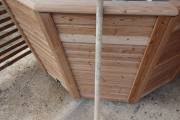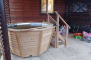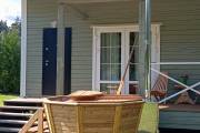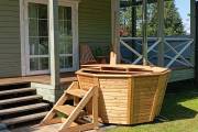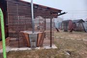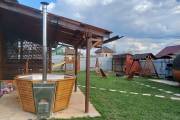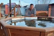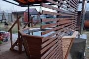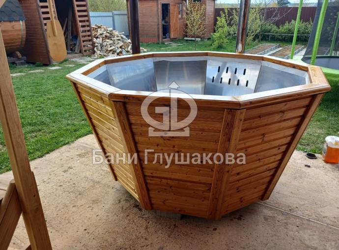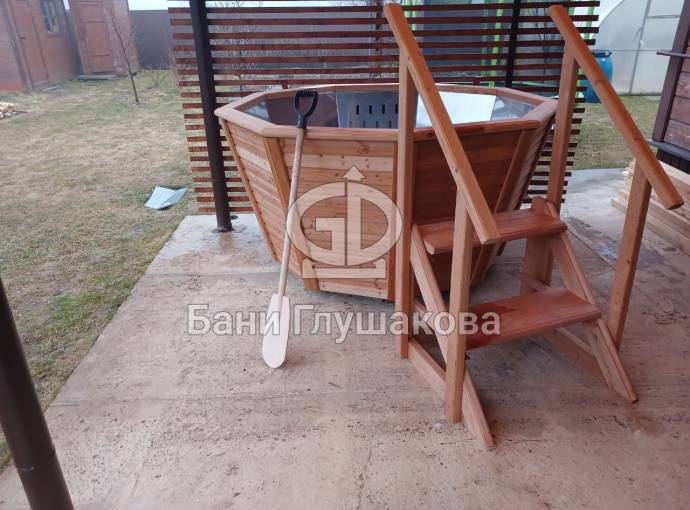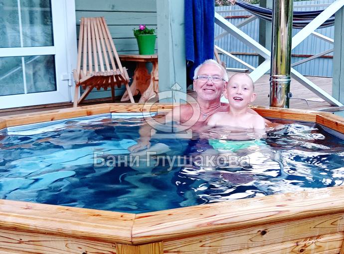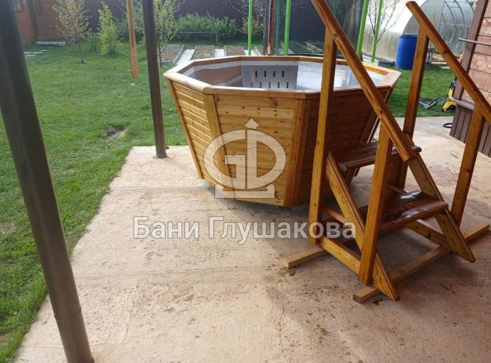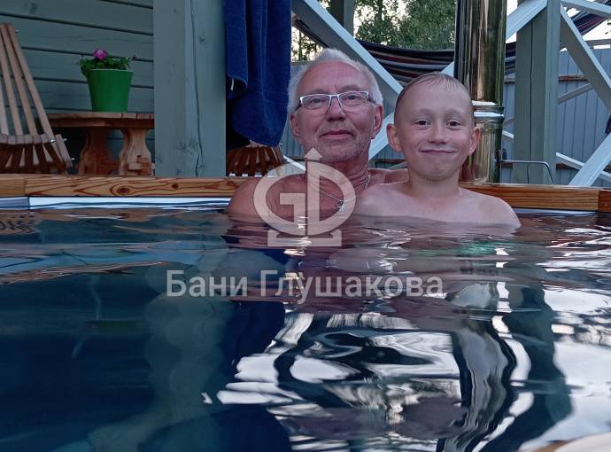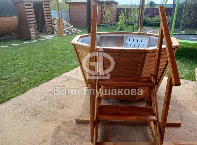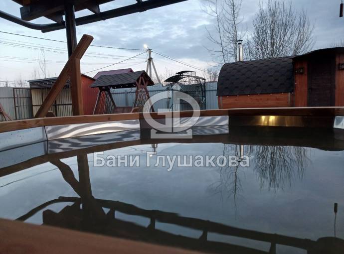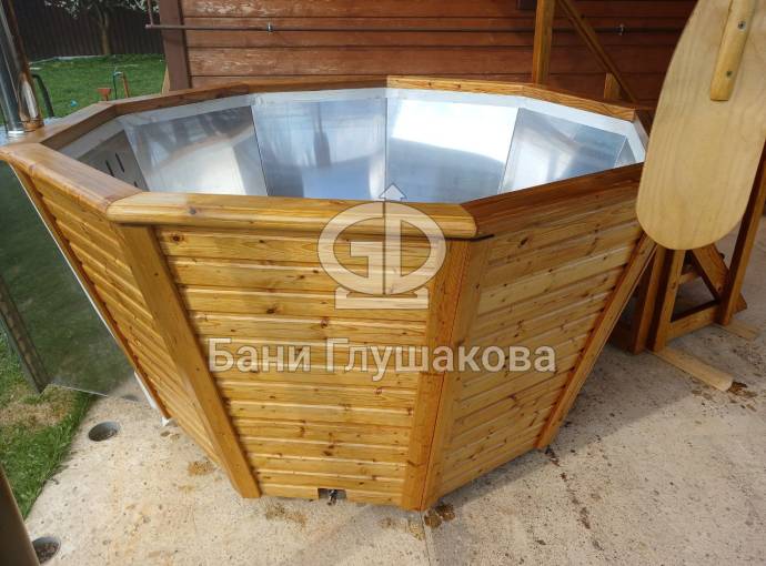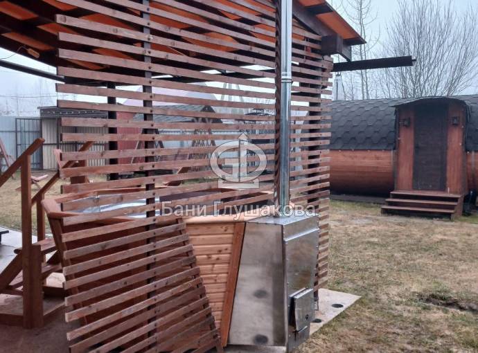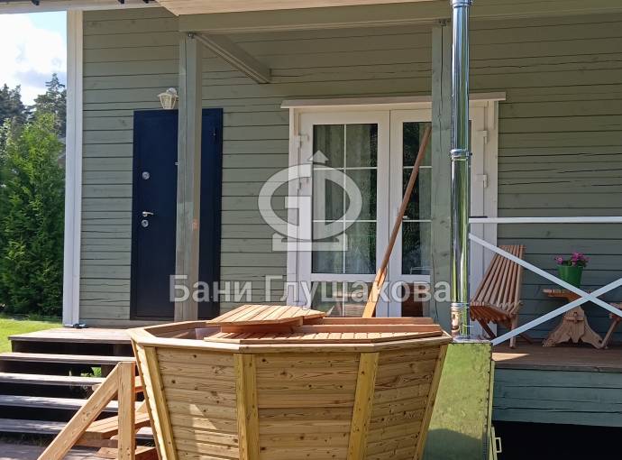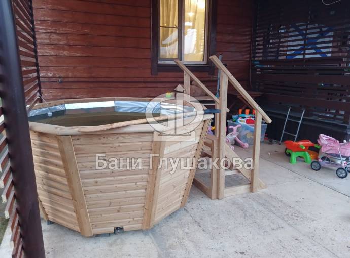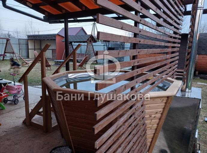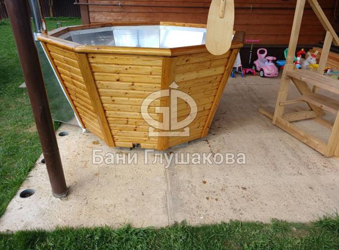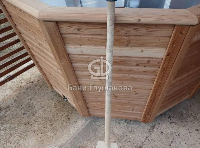 Снаружи купель обшита термомодифицированной вагонкой, которой не страшны сырость и палящее солнце. Можно покрасить в любой цвет.