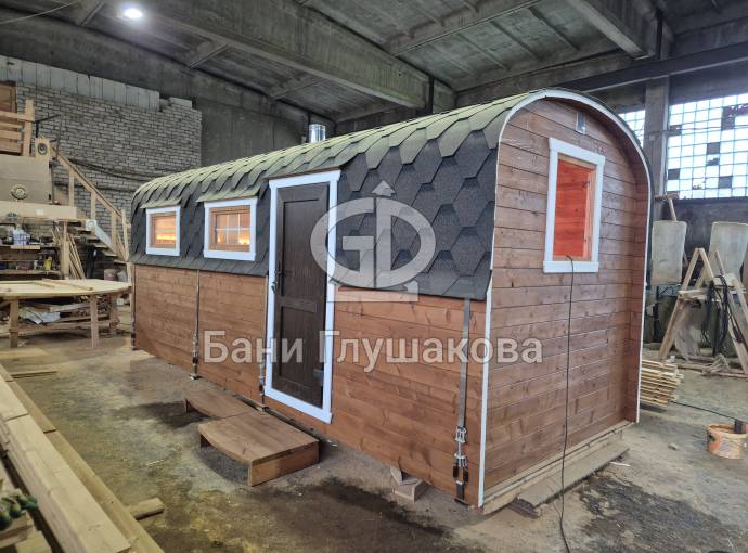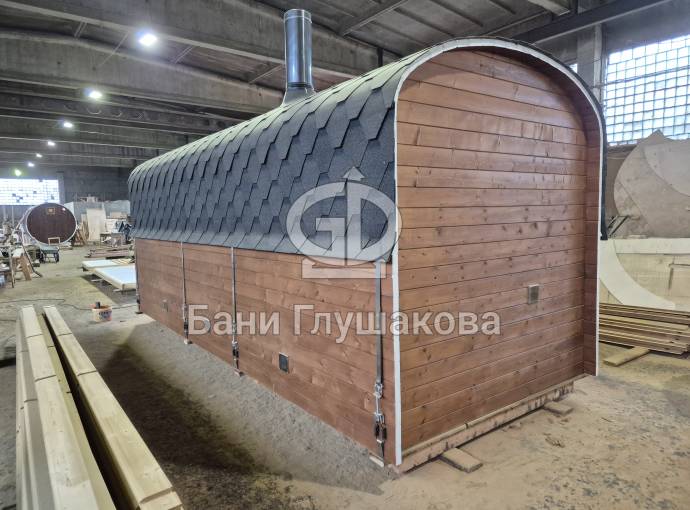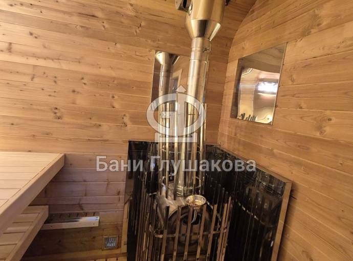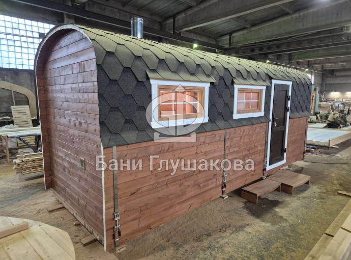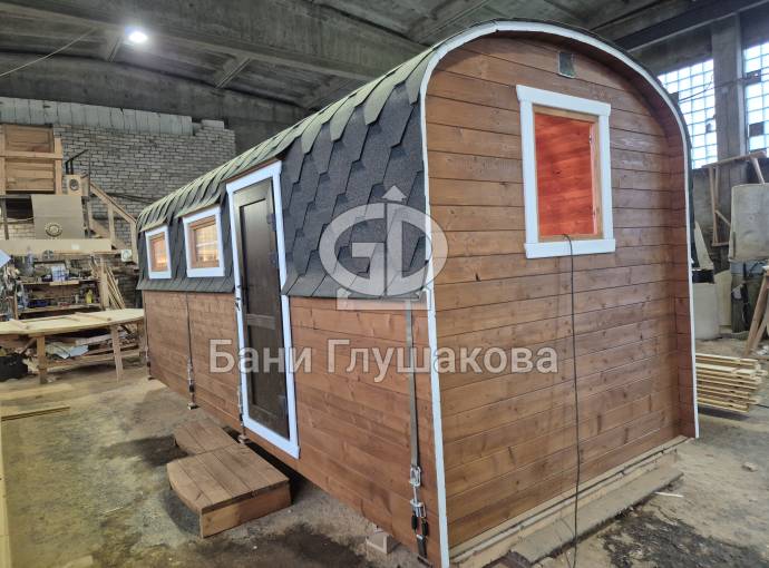 Вашему вниманию предлагаем новинку – перевозную баню «Буханочка» из бочковой термодоски. По сути это гибрид «Кареты» и «Буханочки».