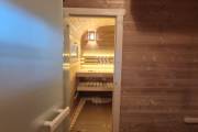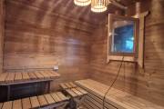 Стандартный размер проекта — 5×6 метров, однако габариты можно изменить под индивидуальные требования заказчика. Внутренняя планировка включает четыре помещения: просторную комнату отдыха, душевую, парную и отдельный санузел.