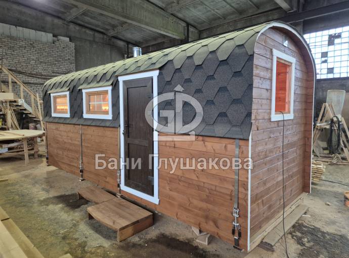 Баня изготавливается из бочковой термодоски — материала, устойчивого к перепадам температур и влаге. Она остаётся лёгкой по конструкции, но при этом рассчитана на круглогодичное использование.