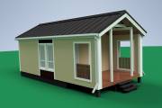 Это проект дачного домика с баней и террасой по каркасной скандинавской технологии: сухой каркас, кровельные свесы 10 мм, столбы на террасе, большие окна.
