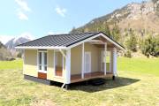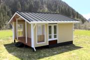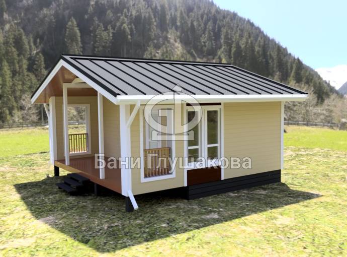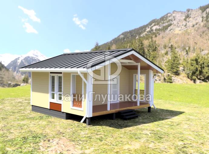 Это проект дачного домика с баней и террасой по каркасной скандинавской технологии: сухой каркас, укороченные свесы, столбы на террасе, большие окна.