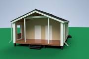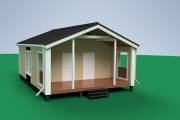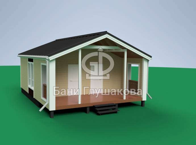 Это проект дачного домика с баней и террасой по каркасной скандинавской технологии: сухой каркас, очень короткие кровельные свесы 10 мм, столбы на террасе, большие окна.