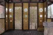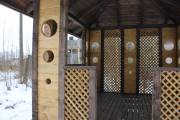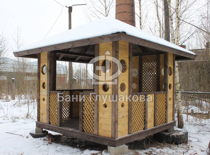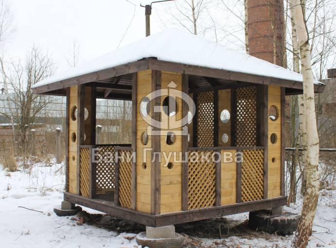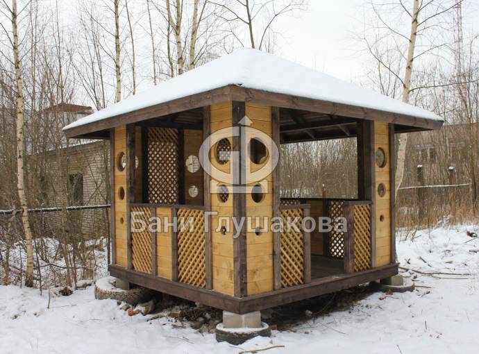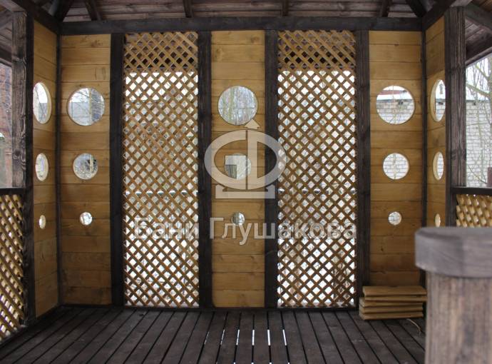 Глухие части беседки заполнены доской со смещением (в елочку)
