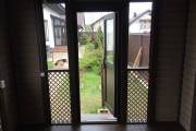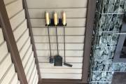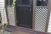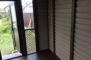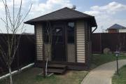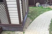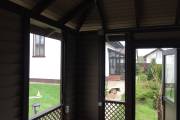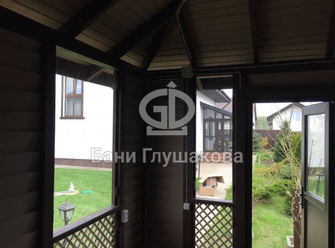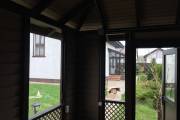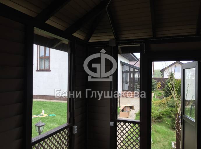 Беседка установлена на винтовые сваи. Основание зашито цокольным кирпичом. На вход установлена отличная дверь стеклопакет. Это идеальный вариант: не разбухает и не усыхает.