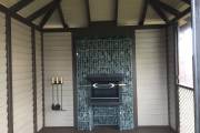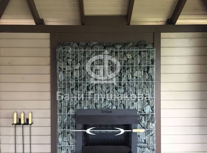 Встроить в заднюю стенку беседки габион-камин, смотрите все фото и видео на странице камина. Но только отличие от фото и виде в том что это будет не полностью стена из камней, а лишь колонна вокруг камина.