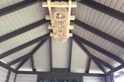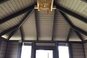 Такие деревянные беседки строятся по каркасной технологии: в основе брусовой каркас, который обшивается фирменным образом «ёлочкой». Такая отделка хороша тем, что полностью прячет крепёж — нигде не торчат шляпки саморезов и гвоздей.
