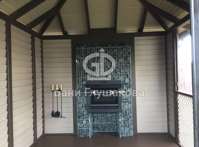 Изюминка беседки — камин в габионе (металлическая конструкция, наполненная камнем). Всё сделано максимально пожаробезопасно.