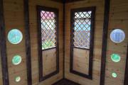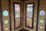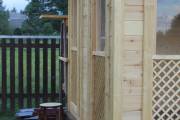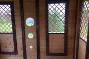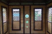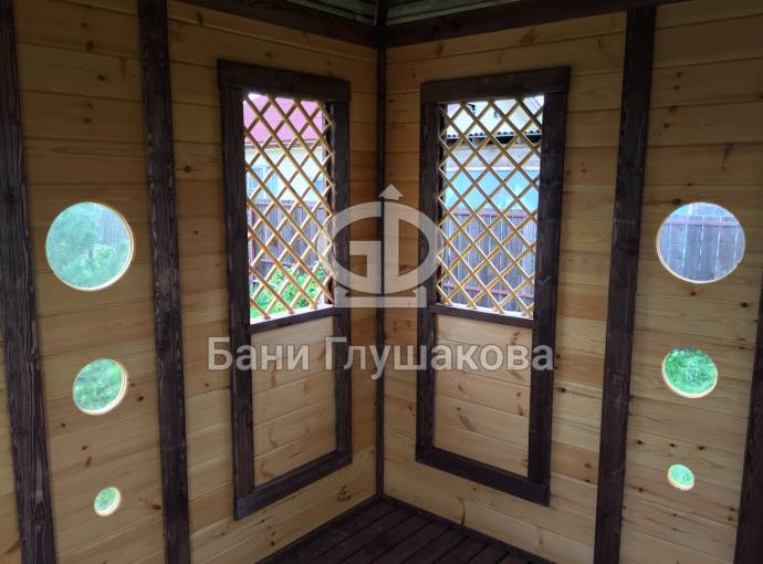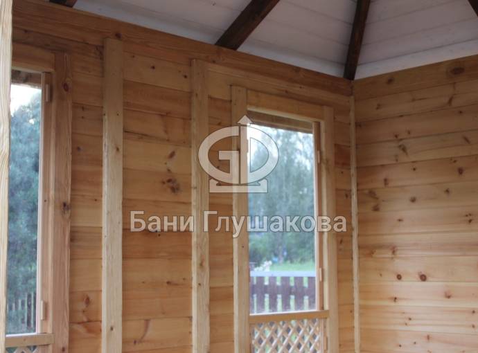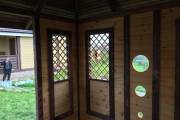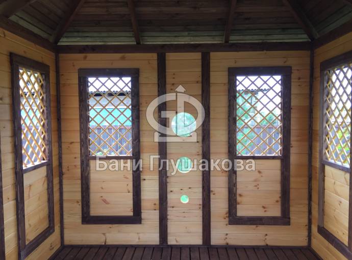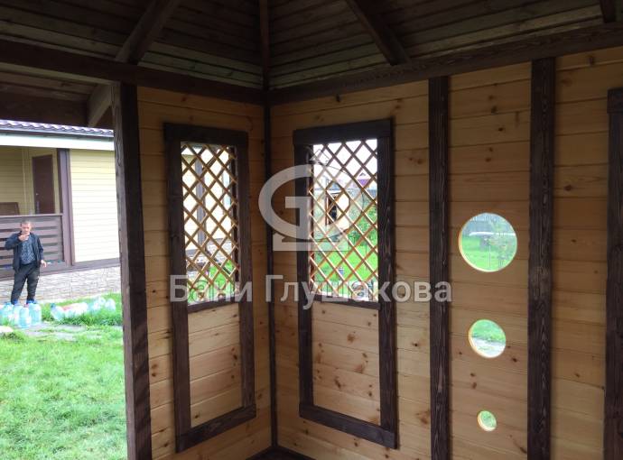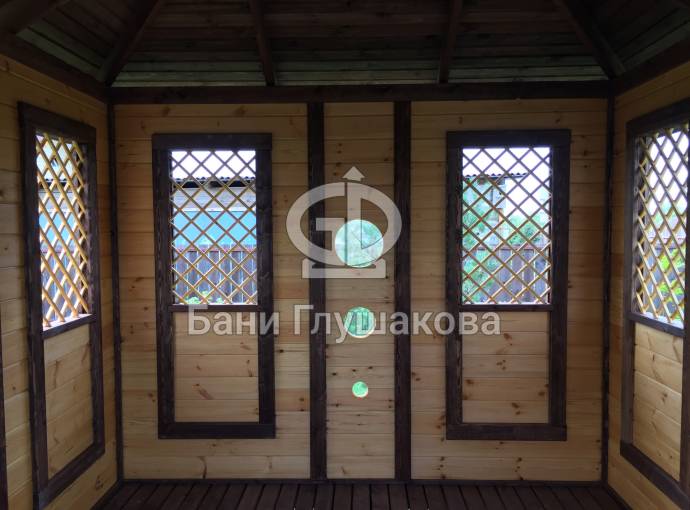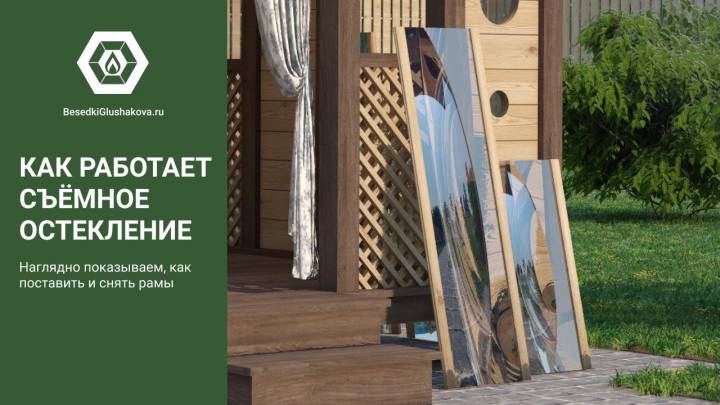 Съемные стекла из оргстекла 4мм на всех проемах, включая там где стоят деревянные сетки (перголы), пример беседки посмотреть по ссылке и также смотрите видео.