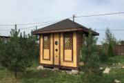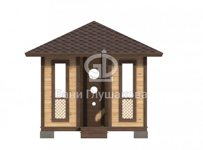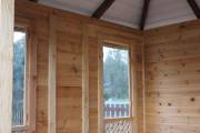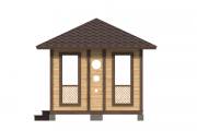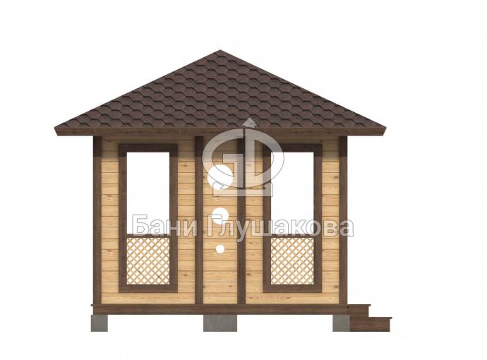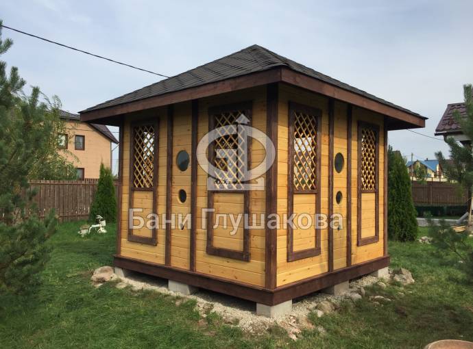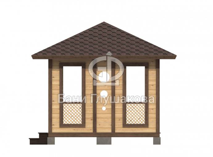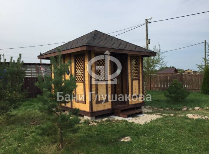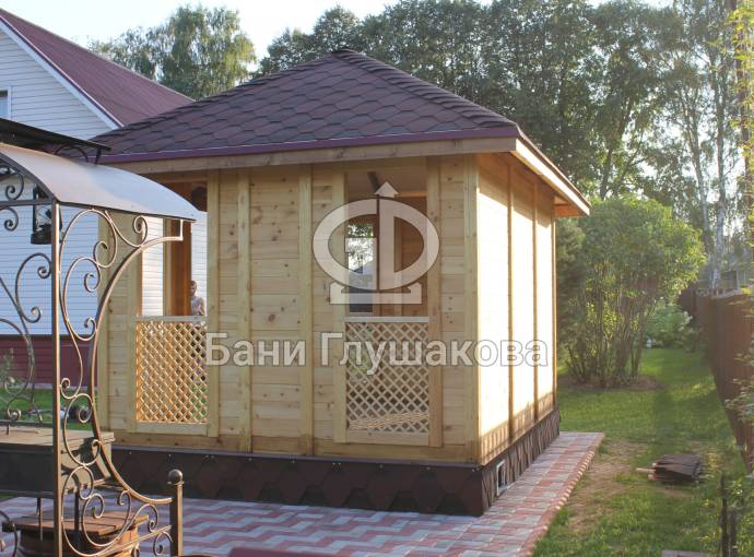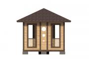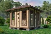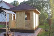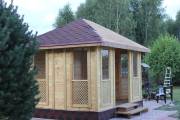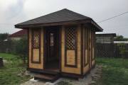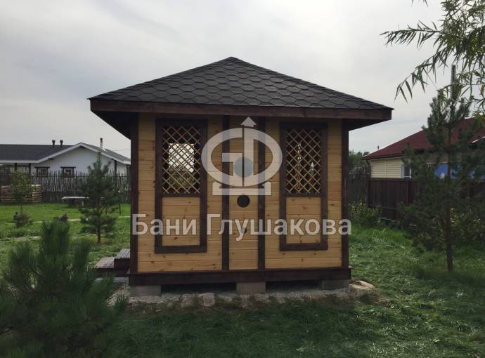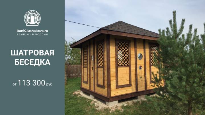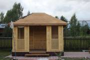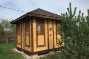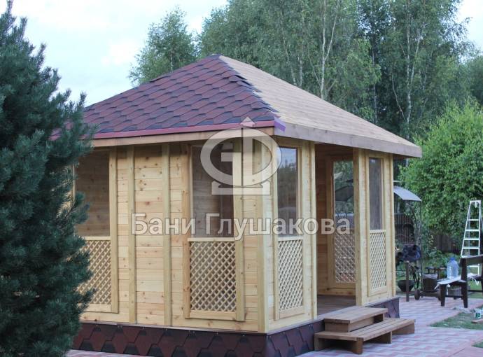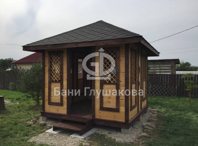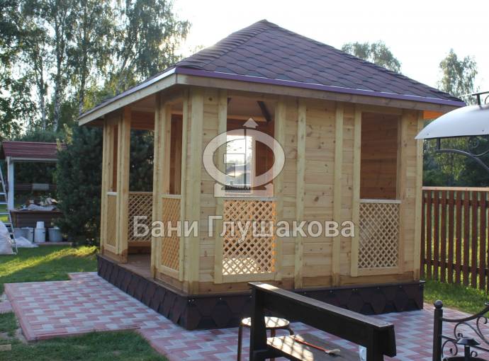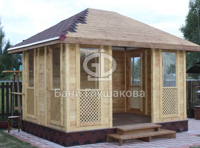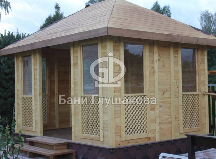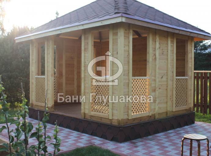 Еще один вариант деревянной садовой беседки шатрового типа размером 3х3. Собирается по каркасной технологии из брусового основания и сухой доски. Есть возможность дополнительного остекления и установки мангала.
