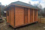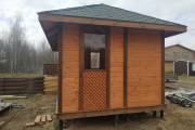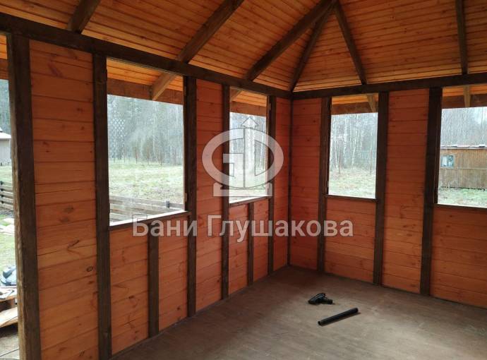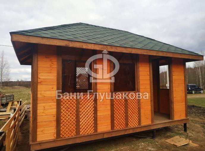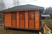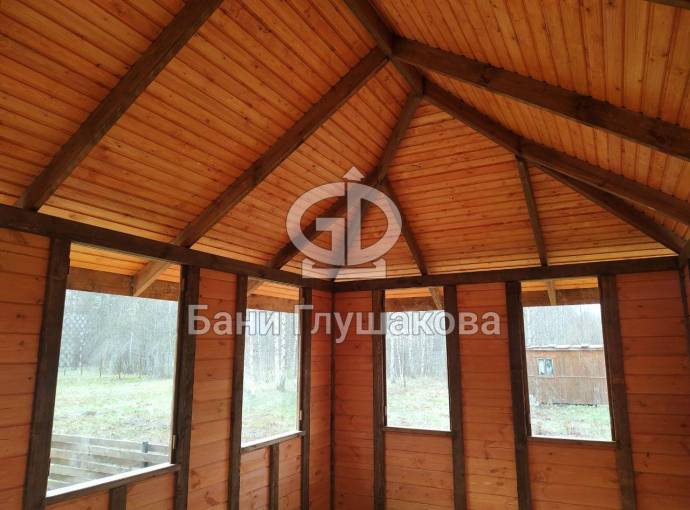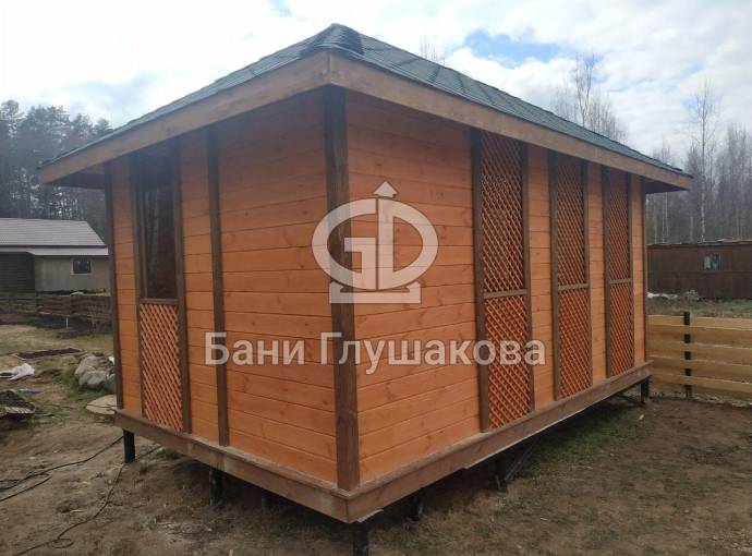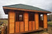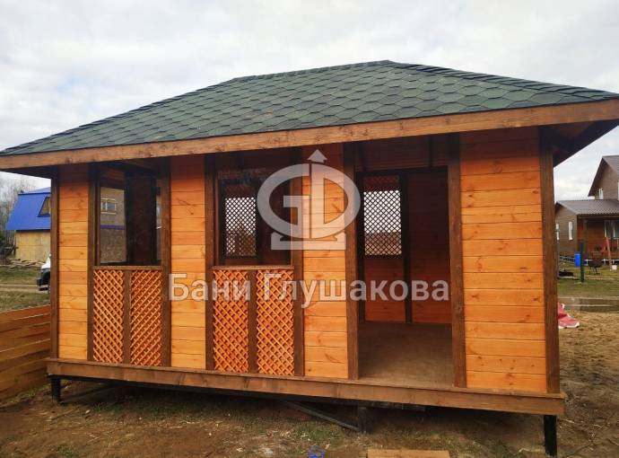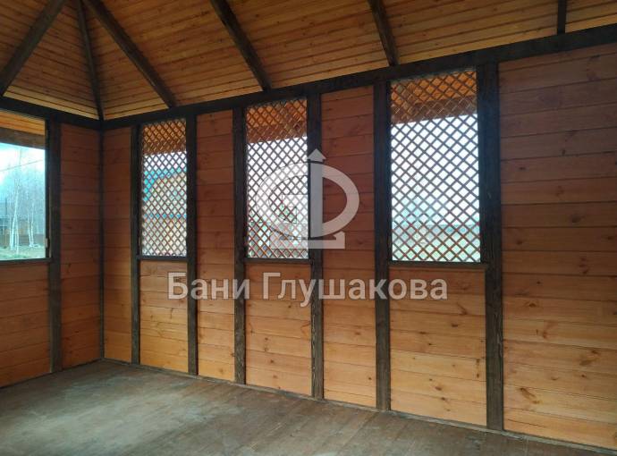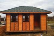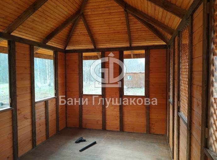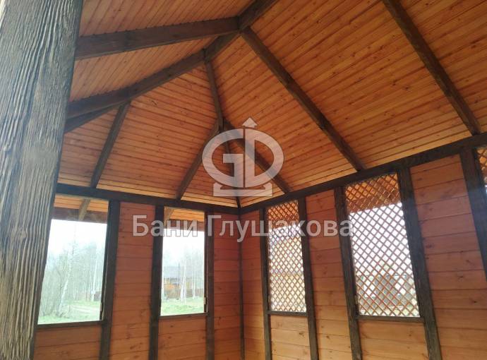 Представленная в проекте беседка сделана по эскизам заказчика, она немного не вписывается в линейку наших беседок, но с разрешения владельца мы всё-таки решили оформить её в отдельный проект.