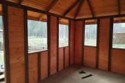 Съемные стекла из оргстекла 4мм на всех проемах, включая там где стоят деревянные сетки (перголы), пример беседки посмотреть по ссылке и также смотрите видео.