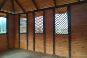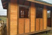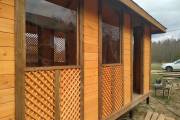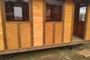 основная фишка наших беседок это съёмное остекление панорамных окон. Это очень удобно — рамы снимаются и устанавливаются буквально за пару минут. Такой беседкой можно пользоваться в любую погоду. Снаружи стены украшены резной решёткой.