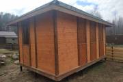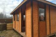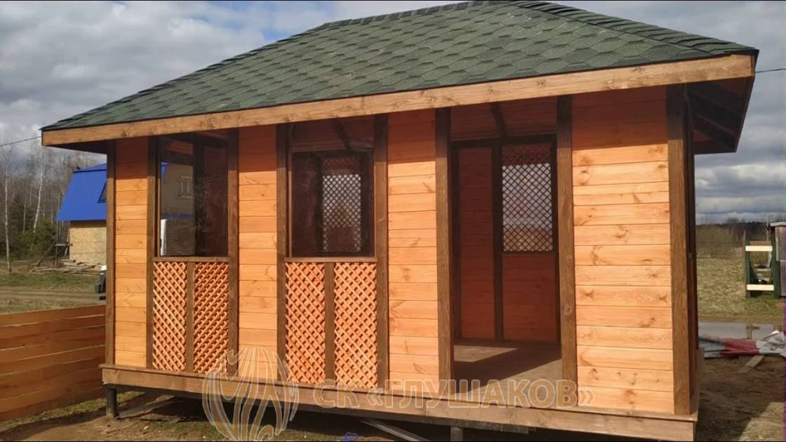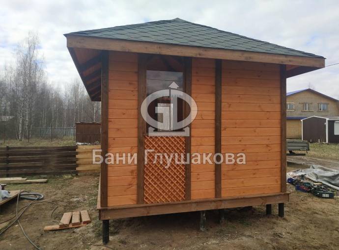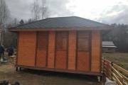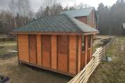 Собрана она по каркасной технологии — в основе лежит брусовой каркас, а снаружи обшита сухой доской. Размер приличный — 3 на 5 метров. Крышу сделали четырёхскатную шатровую. Покрыли мягкой битумной черепицей Технониколь, срок служба 25 лет от производителя.