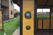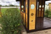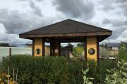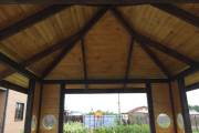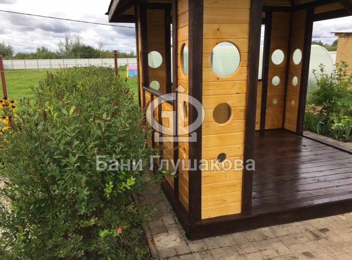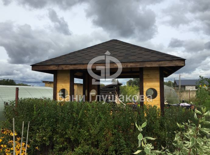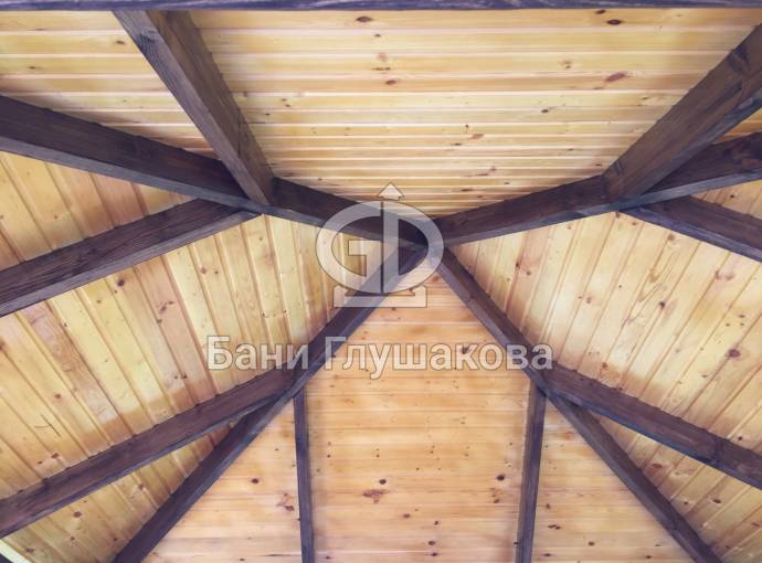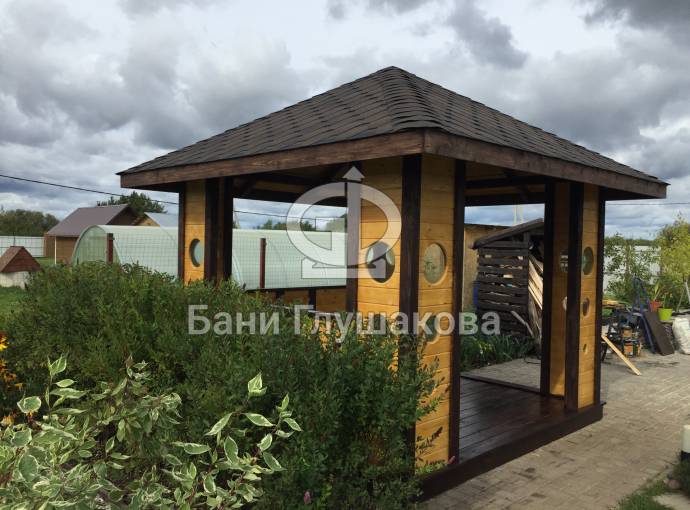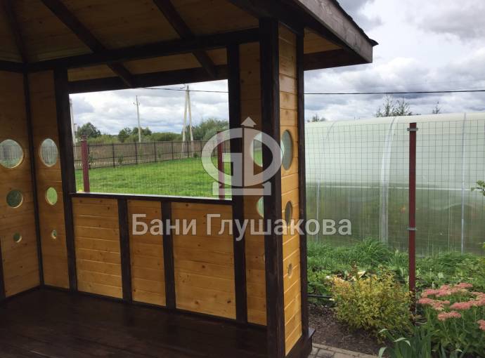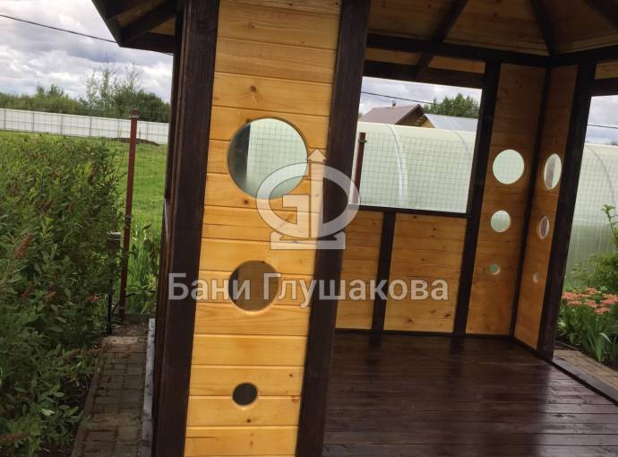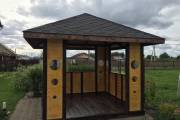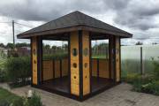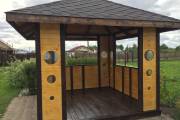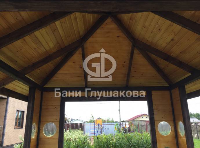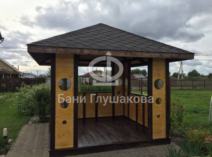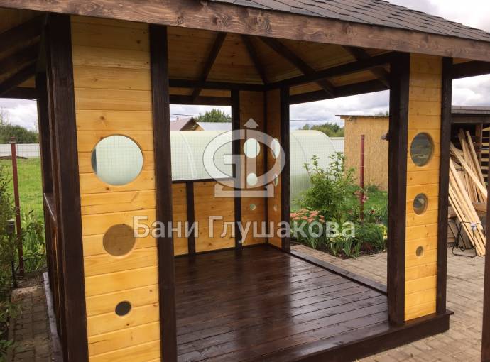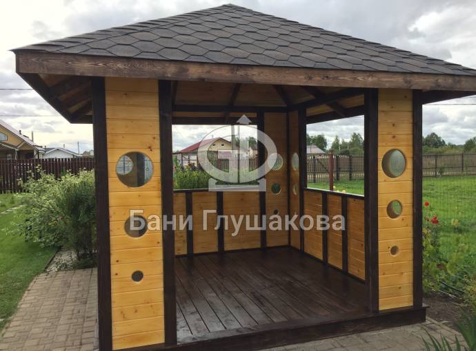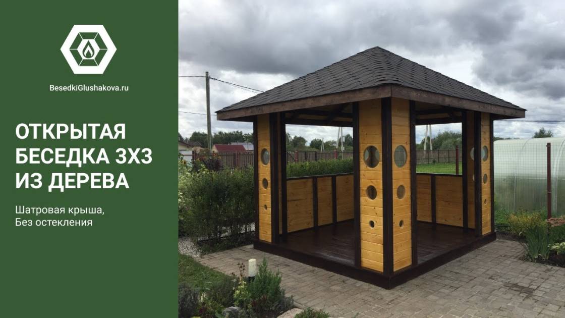 По просьбе заказчика немного переделали классический авторский проект деревянной беседки 3 на 3 (это который с закрытыми наполовину решёткой оконными проёмами) в очень красивую открытую беседку с шатровой крышей.