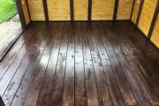Беседка собирается на участке по каркасной технологии — основание и стойки изготовлены из бруса 100х100, стена набраны профильной доской. Снаружи и внутри всё покрашено на 2 слоя защитной краской Акватекс.