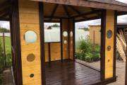 Беседка сделана из элементов вырезанных с помощью станков с ЧПУ, из сухой строганной доски