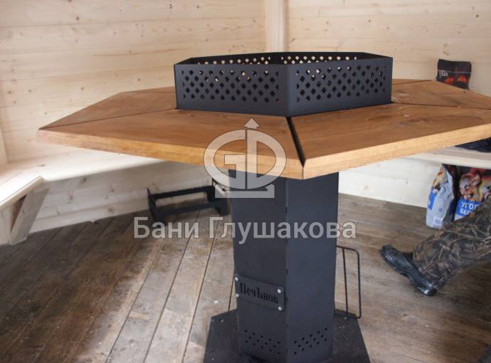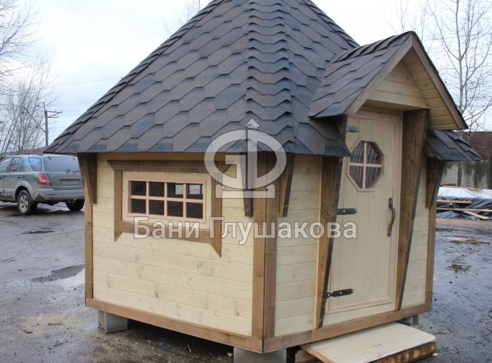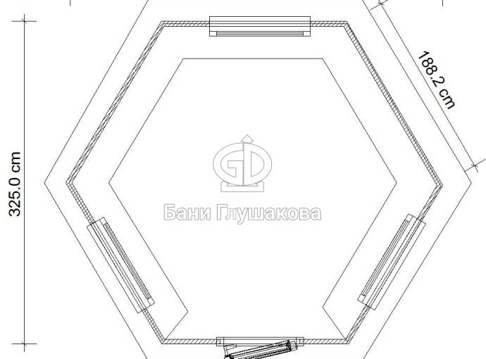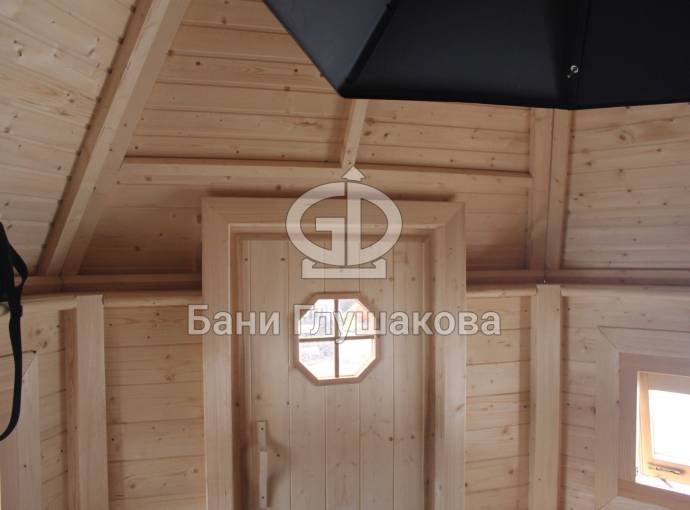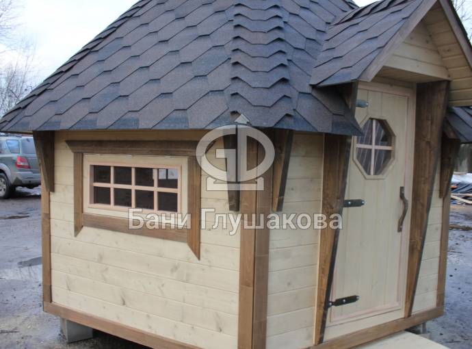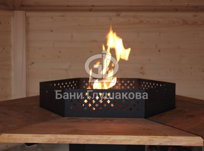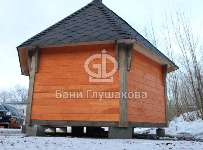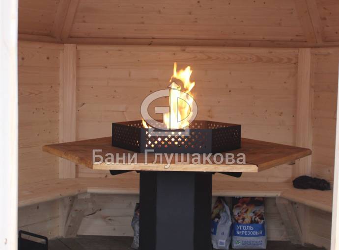 В основе лежит шестигранник диаметром 3 метра. Площадь такой беседки составляет 9 кв.м. Сборка осуществляется по каркасной технологии (отдельно можно заказать дополнительное утепление) из сухой доски. Внутри по периметру устанавливаются лавки, оставляя центр пустым для установки мангала, печи, барбекю...