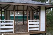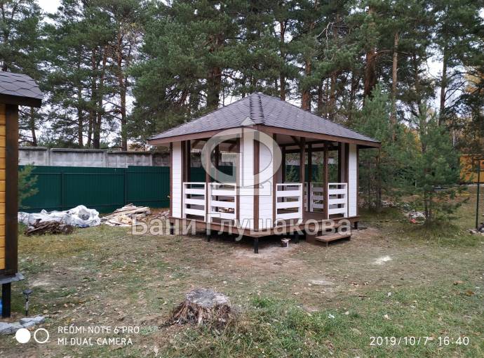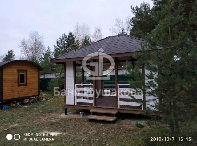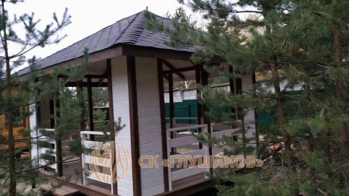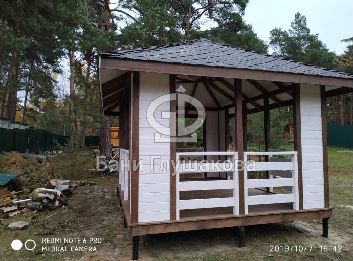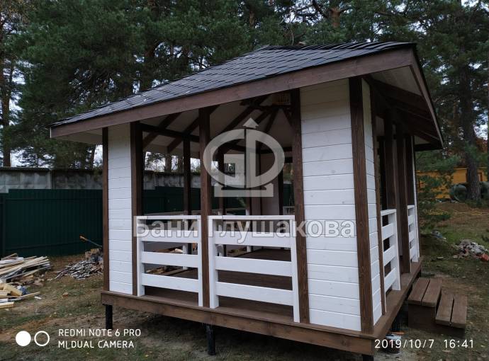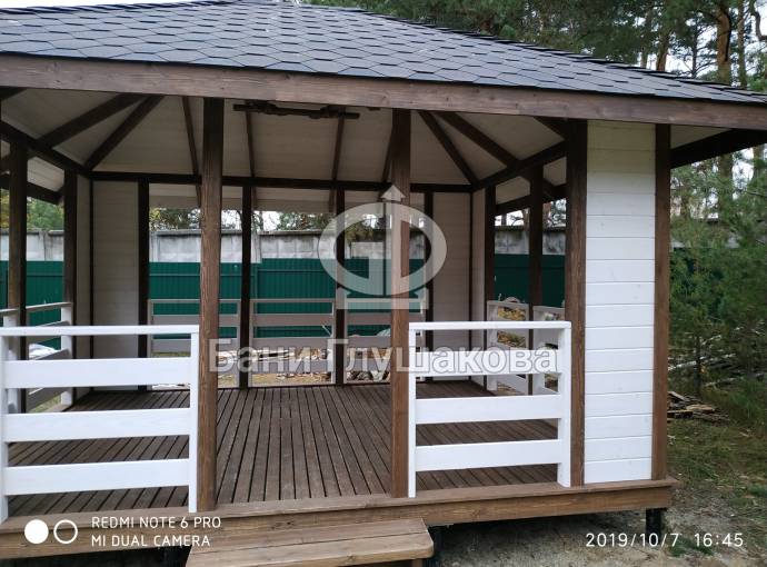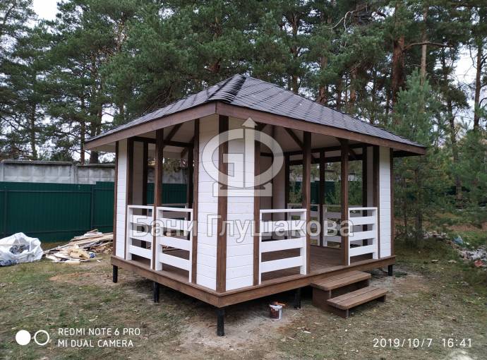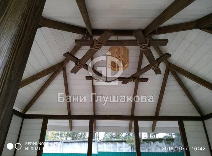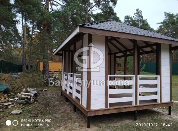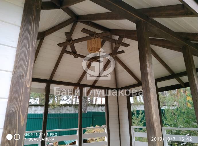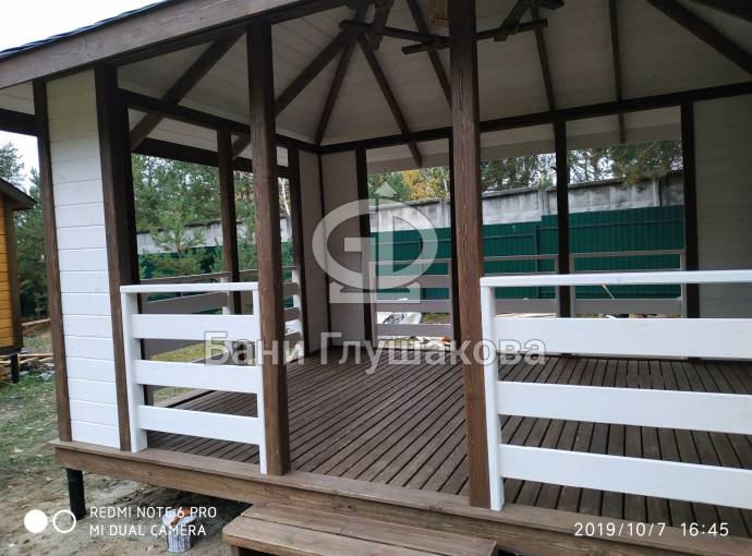 Из-за больших пролётов нельзя поставить остекление, но по задумке клиента беседка предназначена для летнего использования. Заказчику мы строили брусовую баню «Буханочка» 6х3. Убедившись в наших надёжности, качестве и профессионализме, он не стал искать другого застройщика и заказал у нас и беседку.
