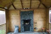 Встроить в заднюю стенку беседки габион-камин, смотрите все фото и видео на странице камина. Но только отличие от фото и виде в том что это будет не полностью стена из камней, а лишь колонна вокруг камина.