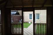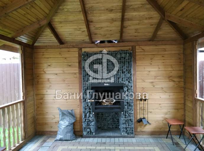 Беседка размером 4 на 4 метра собрана по каркасной технологии из брашированной (то есть искусственно состаренной) доски 42 мм. В основе каркаса лежит брус 100х100 мм. Внутри шатровой беседки «Патио» установлен камин с опциями мангала и барбекю. Камин встроен в габион — металлическую конструкцию, заполненную камнями габбро-диабаза.