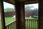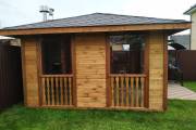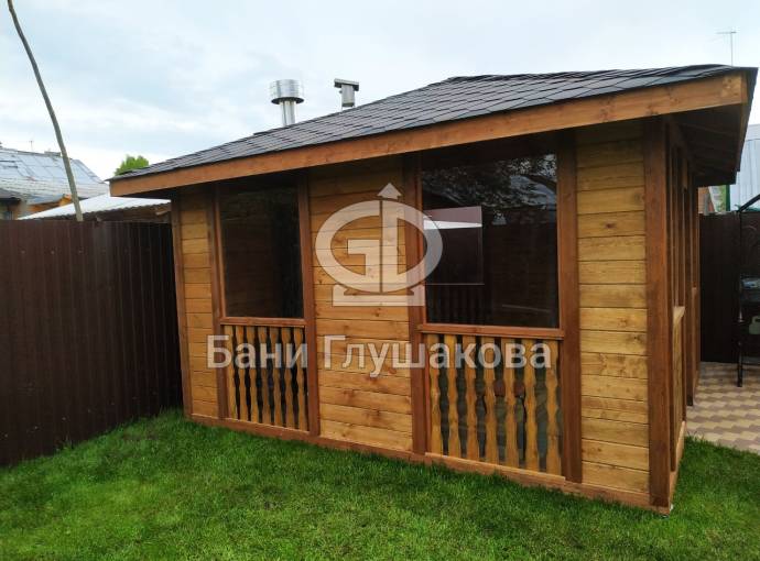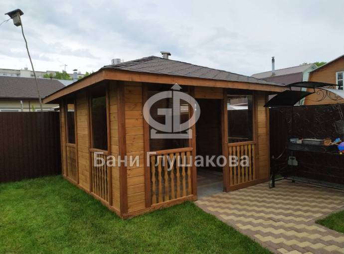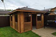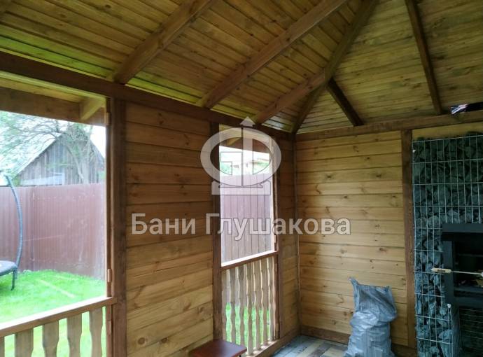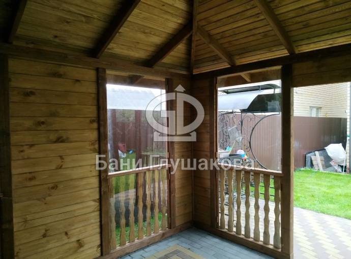 Также сделаны большие панорамные окна. Из-за увеличенного размера цена такой беседки с остеклением выходит немного дороже других наших проектов беседок размером 4 на 4 метра. Но можно заказать и такой вариант.
