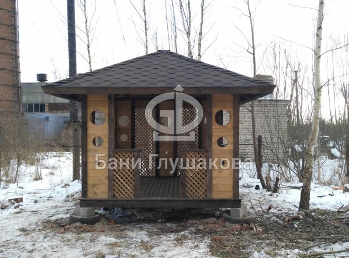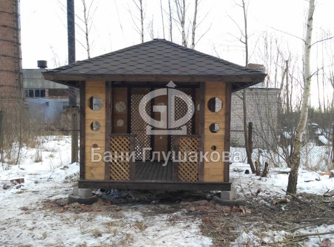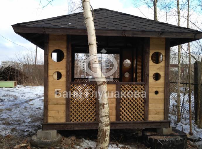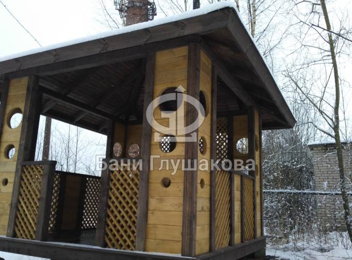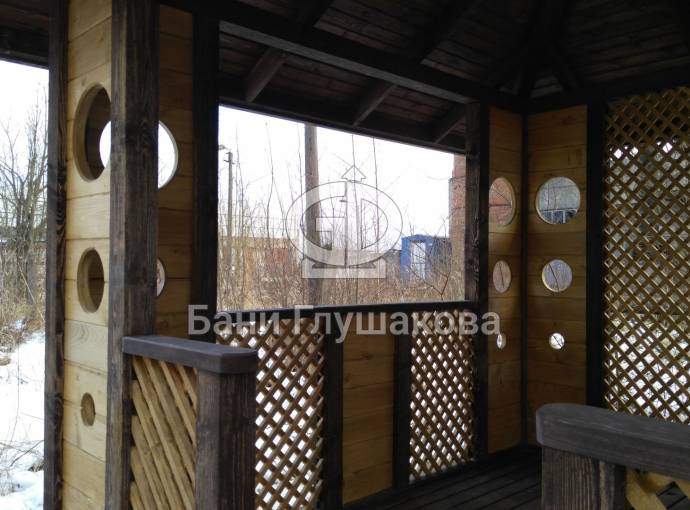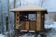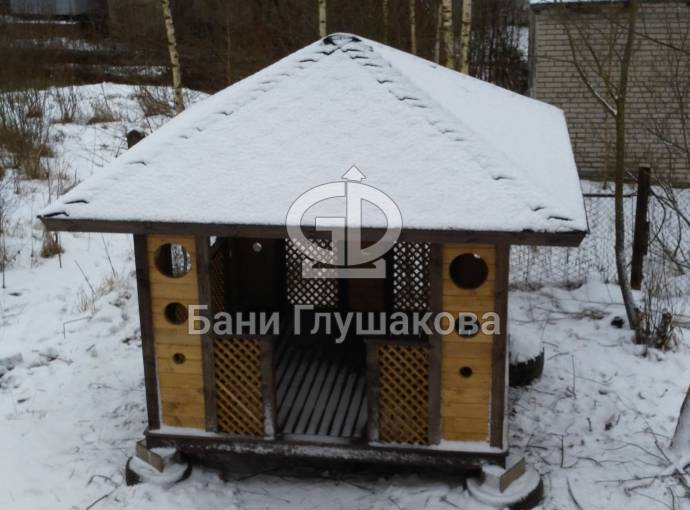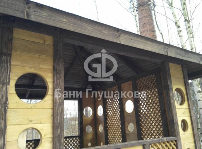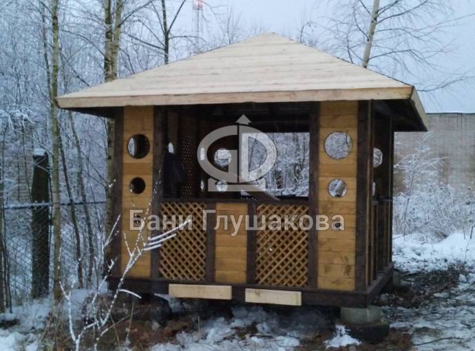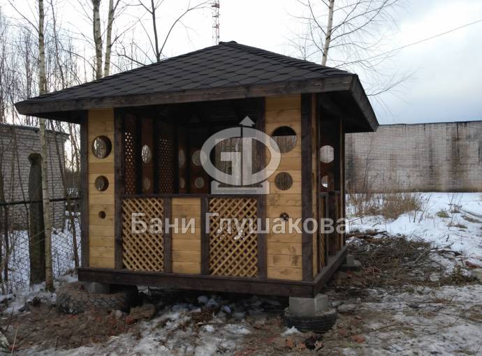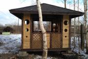 Беседка собирается по каркасной технологии из сухой доски 42 мм. В основе — брус 100х100 мм. Крыша покрывается мягкой финской черепицей Технониколь Shinglas. Снаружи и внутри стены и пол покрашены защитным составом БиоТекс. Цвет — любой на выбор клиента.