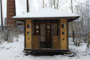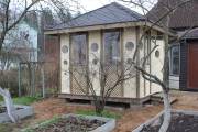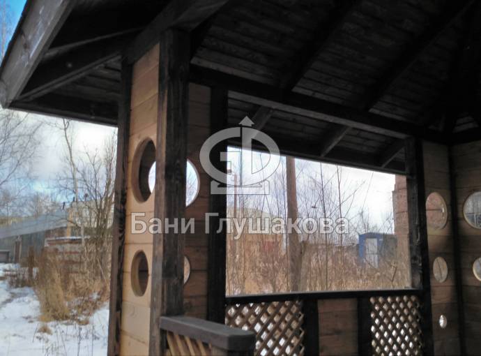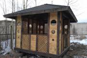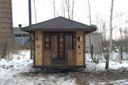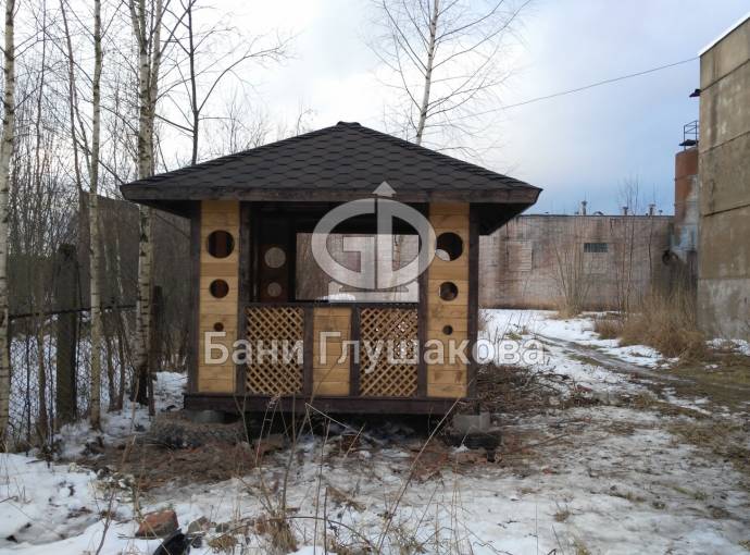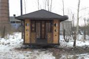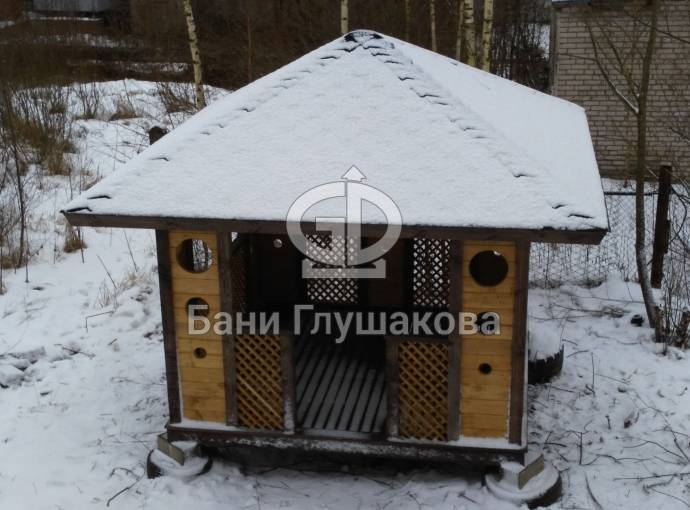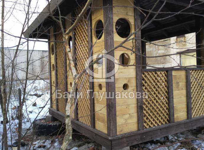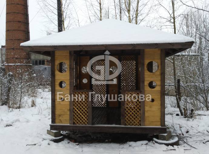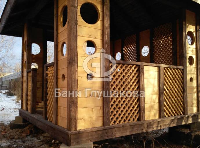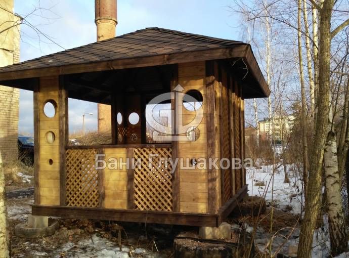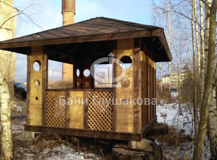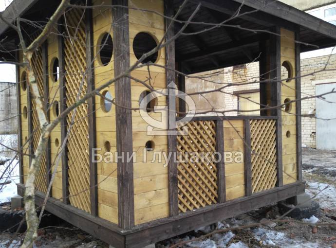 Беседка собирается по каркасной технологии из сухой доски 42 мм. В основе — брус 100х100 мм. Крыша покрывается мягкой финской черепицей Технониколь Shinglas. Снаружи и внутри стены и пол покрашены защитным составом БиоТекс. Цвет — любой на выбор клиента.