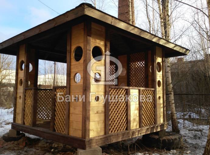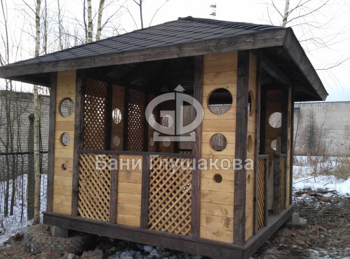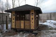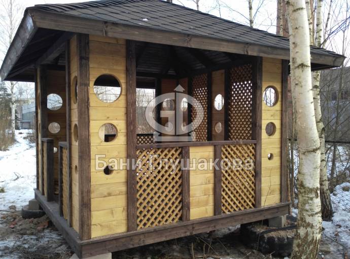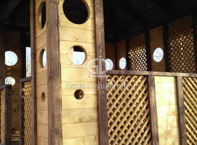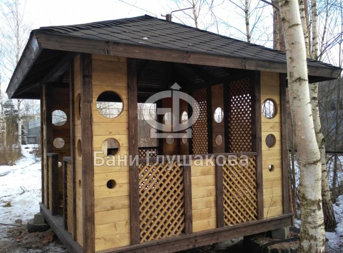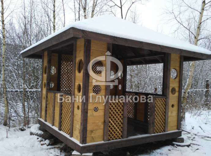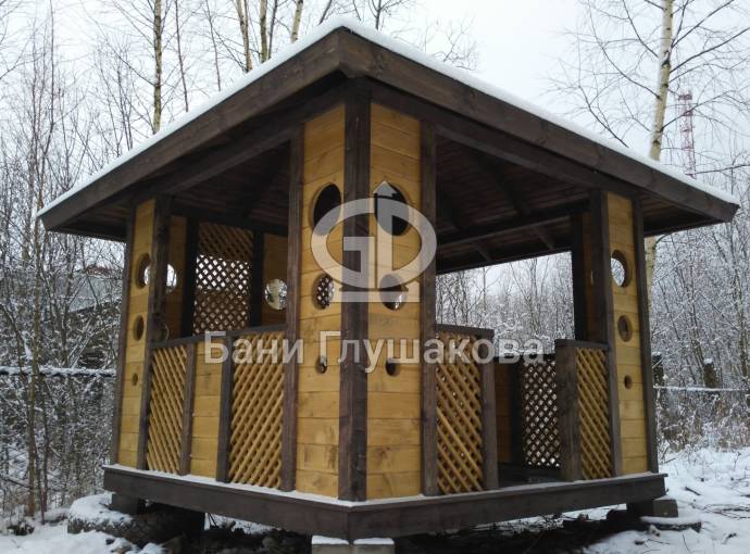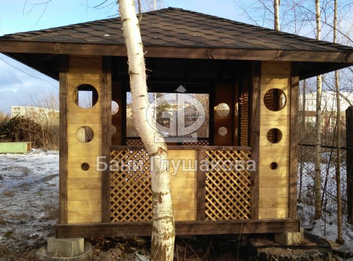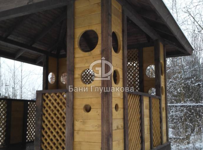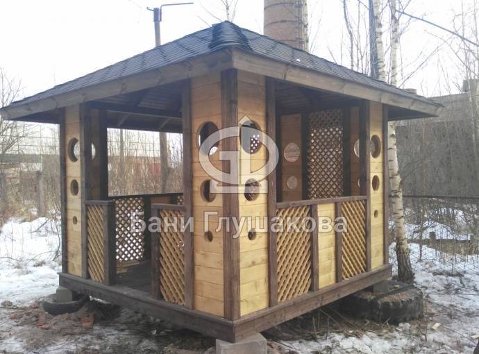 Глухие части беседки заполнены доской со смещением (в елочку)