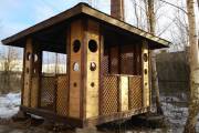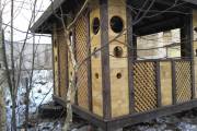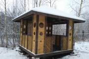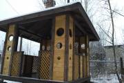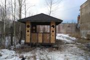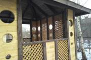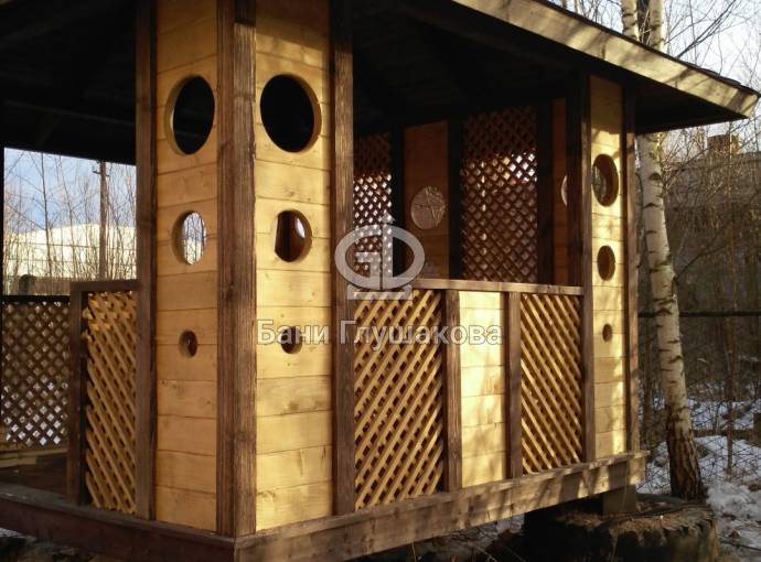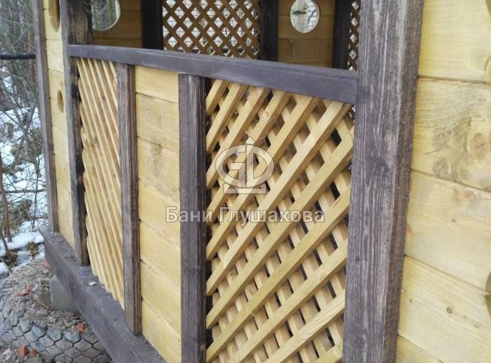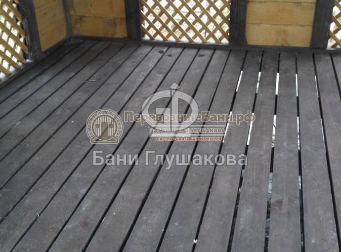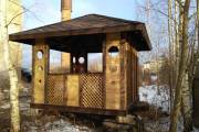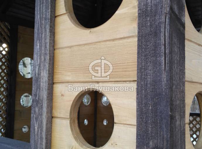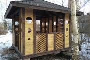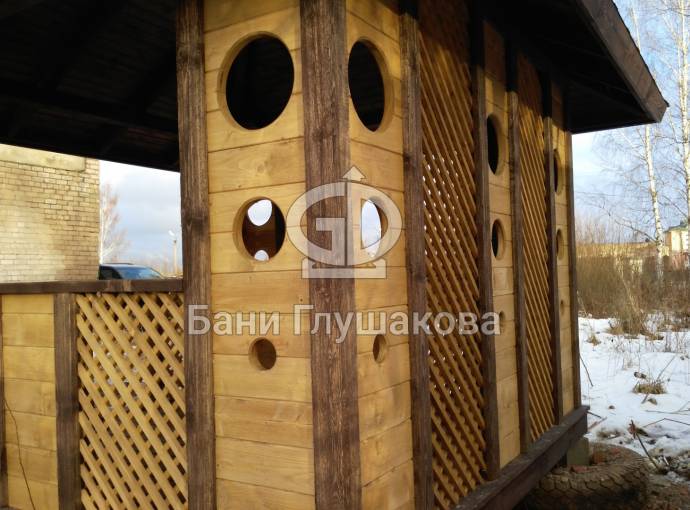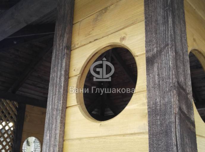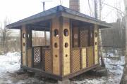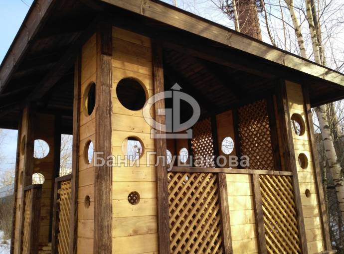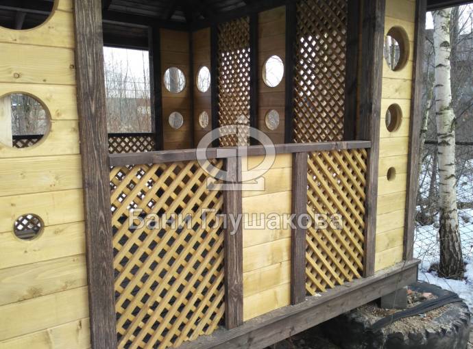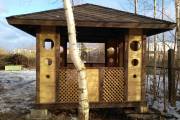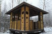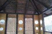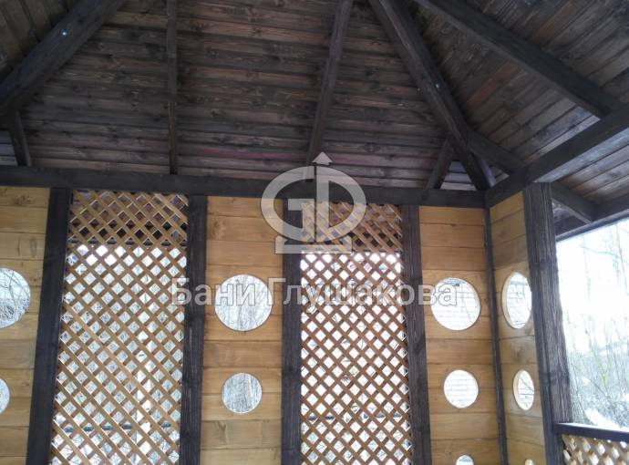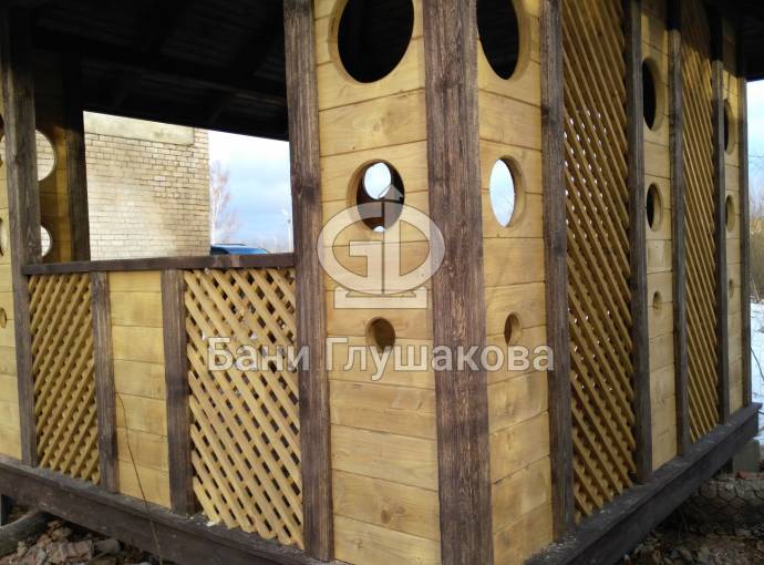 Глухие части беседки заполнены доской со смещением (в елочку)