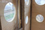 В стоимость входит дверь с круглым окном, замок, ручка. Можно заменить на пластиковую дверь