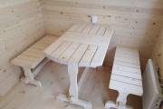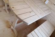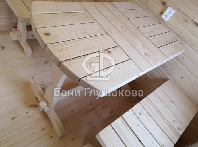 Массивная мебель нашего производства, основа из фанеры, верх из массива, стол и две скамейки, есть табуреты но их нужно оговаривать отдельно.