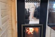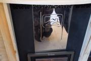 Если топка через стену то можно сделать красивые наличники из брашированной доски с полочкой на верху,
