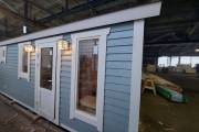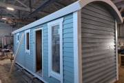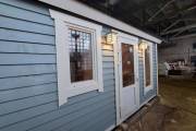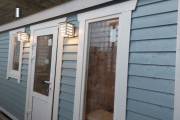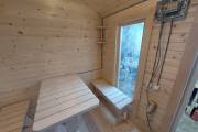 Отличная перевозная баня в красивом синем цвете, покрашенная Тиккурилой — одна из лучших красок для деревянных фасадов. Сборка из доски внахлёст. Изнутри обшита бессучковой вагонкой высокого класса.
