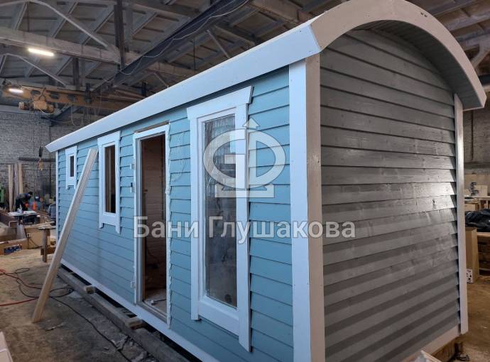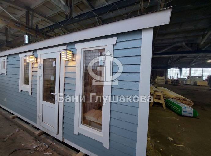 Это каркасная баня «Буханочка» 2,2 на 6 метров с утеплением и душем. Сейчас в процессе сборки. Будет готова к 25 января.