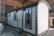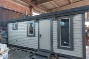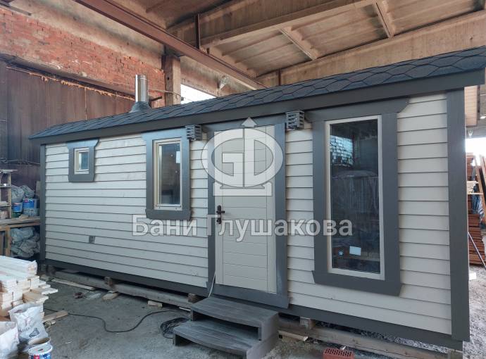 Это каркасная баня «Буханочка» 2,2 на 6 метров с душем — новина на нашей выстаовчной площадке в Санкт-Петербурге.