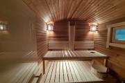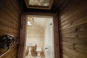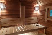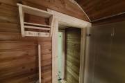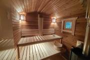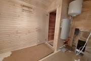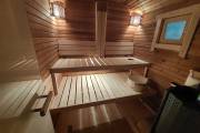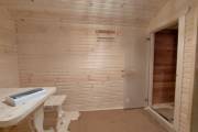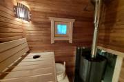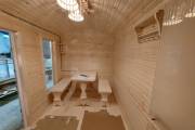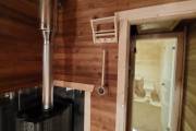 Внутри 3 отделения: комната отдыха (здесь комплект мебели, люстра, электрика), парная обшита термодоской (широченные полки, вентиляция «второе дыхание», вентиляция «Димасту», печь Костёр Rain с красивым металлическим экраном с двух сторон, светильники, каменка на трубе). Душевая также обшита термомодифицированной доской, сделаны металлические пороги, установлено душевое оборудование, повешено обливное устройство «Обливасту».
