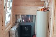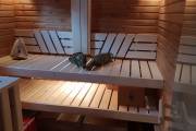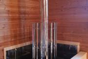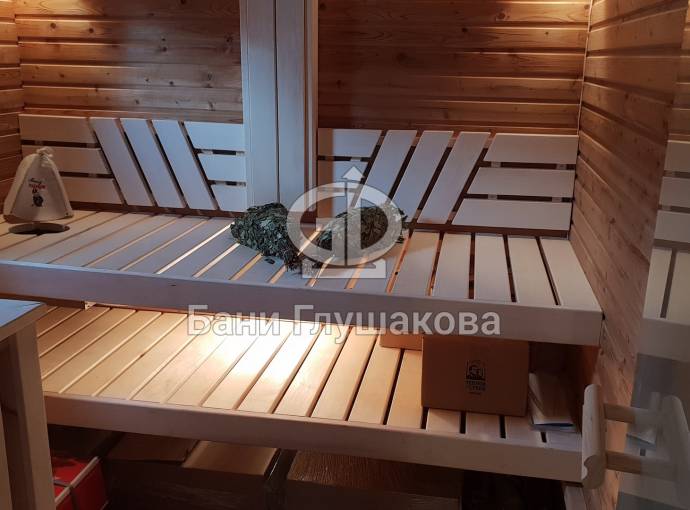 Внутри 3 отделения: комната отдыха (здесь комплект мебели, люстра, электрика), парная обшита термодоской (широченные полки, вентиляция «второе дыхание», вентиляция «Димасту», печь Костёр Rain с красивым металлическим экраном с двух сторон, светильники, каменка на трубе). Душевая также обшита термомодифицированной доской, сделаны металлические пороги, установлено душевое оборудование, повешено обливное устройство «Обливасту».