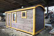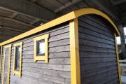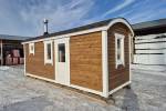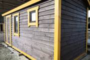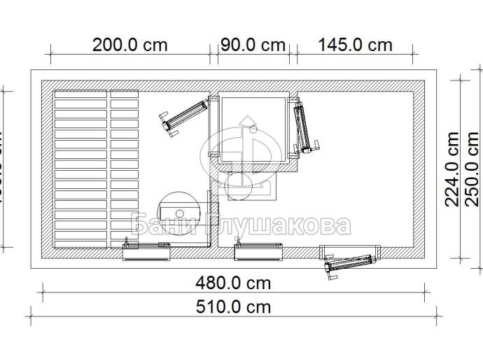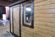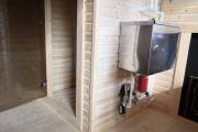 Даже очень маленькие бани для дачи могут быть современными и комфортными. В такую малышку «Буханочку» длиной 4,8 метра поместились двухметровая парная, душевое отделение и крохотная комната отдыха с мебелью. Топка вынесена в комнату отдыха — так гораздо удобнее. Душевая система с баком и насосом также расположена за пределами маленькой кабинки со смесителем и лейкой.