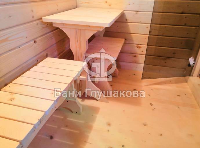 Массивная мебель нашего производства, основа из фанеры, верх из массива, стол и две скамейки, есть табуреты но их нужно оговаривать отдельно.