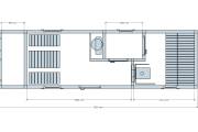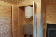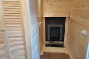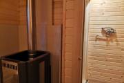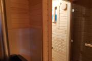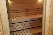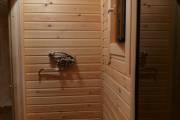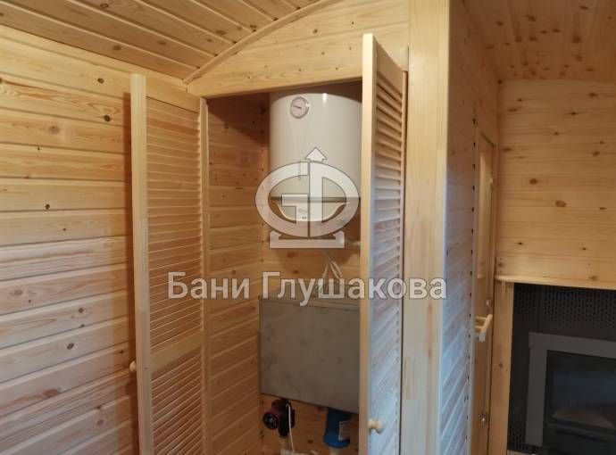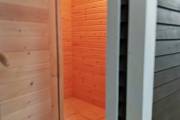 В этой бане 4 помещения: парная, комната отдыха, душевая и хозблок. Конкретно в этой модели клиент попросил сделать отдельный шкаф для душевой системы — чисто в эстетических целях. Смотрится и правда очень аккуратно.