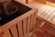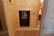 Обратите внимание, что выносная топка печи выводится в помывочную, а душевая система располагается в комнате отдыха. В эти помещения установлены стеклянные двери, а во всю площадь помывочной лежит пластиковый поддон — так что можно плескаться сколько душе угодно.