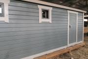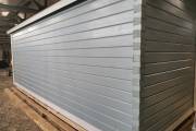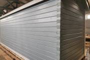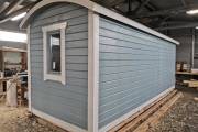 Сухая, строганная, покрашенная и только потом установленная доска внахлест одна на другую, (если это баня «Барн», то обшивается имитацией бруса), если баня «Кубота», то планкеном.