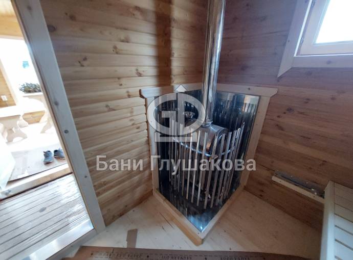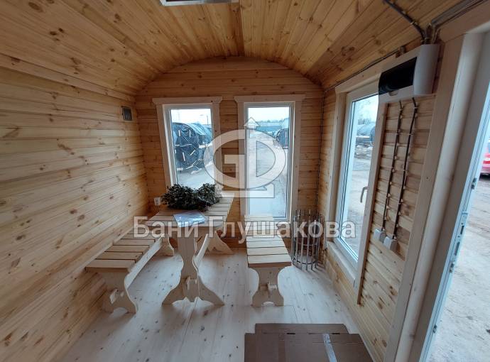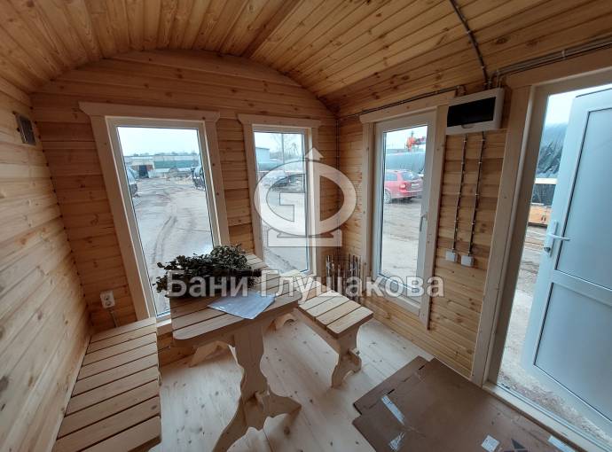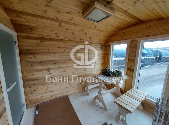 Благодаря высоким окнам внутри бани светло и просторно. Она на 20 см шире стандартной «Буханочки» – и, поверьте, это заметно. Никакой скованности не ощущаешь, стены не давят. В общем, то что надо!