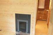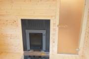 Если топка через стену то можно сделать красивые наличники из брашированной доски с полочкой на верху,
