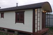 Сухая, строганная, покрашенная и только потом установленная доска внахлест одна на другую, (если это баня «Барн», то обшивается имитацией бруса), если баня «Кубота», то планкеном.