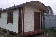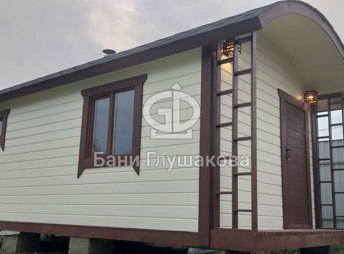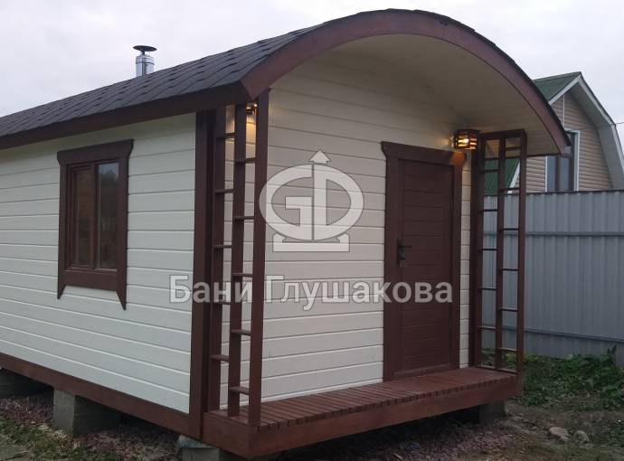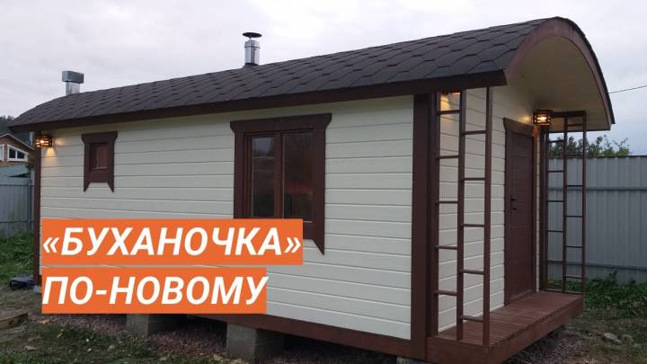 Модифицированный проект бани «Буханочка» с небольшой террасой предназначен для сборки на участке. Стандартный размер 3 на 6 метров.