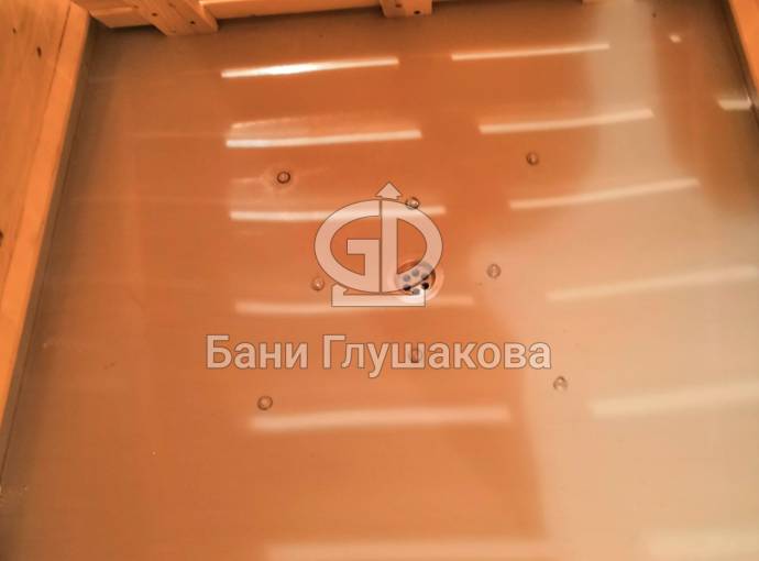 Установлен в помывочном отделении пластиковый герметичный поддон с сифоном для слива воды, в него вложен деревянный трапик (в планировках, где подразумевается душевое помещение). Ссылка на фото и видео